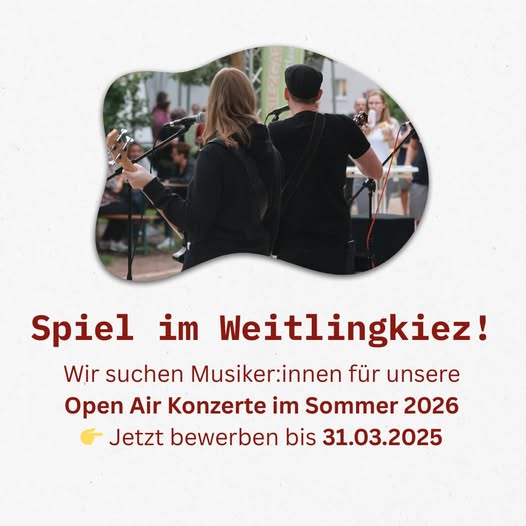 Wir suchen kreative und talentierte Musiker:innen für unsere Open Air Sommerkonzerte im Lichtenberger Weitlingkiez! Wenn ihr Lust habt, auf einer unserer Bühnen zu spielen, dann bewerbt euch jetzt!