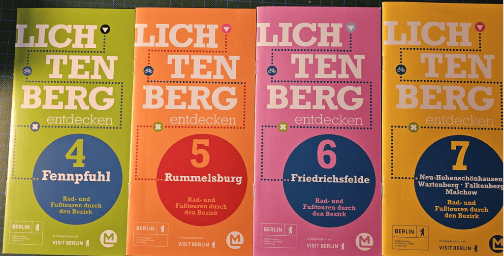 - Karten für Rad- und Fußtouren in Lichtenberg-Hohenschönhausen (insgesamt 7 Touren, zumindest die ersten 3 als Download unter https://www.museum-lichtenberg.de/index.php/angebote/publikationen/805-lichtenberg-entdecken); alle Karten liegen im Museum Lichtenberg oder auch im Rathaus zur Mitnahme aus.