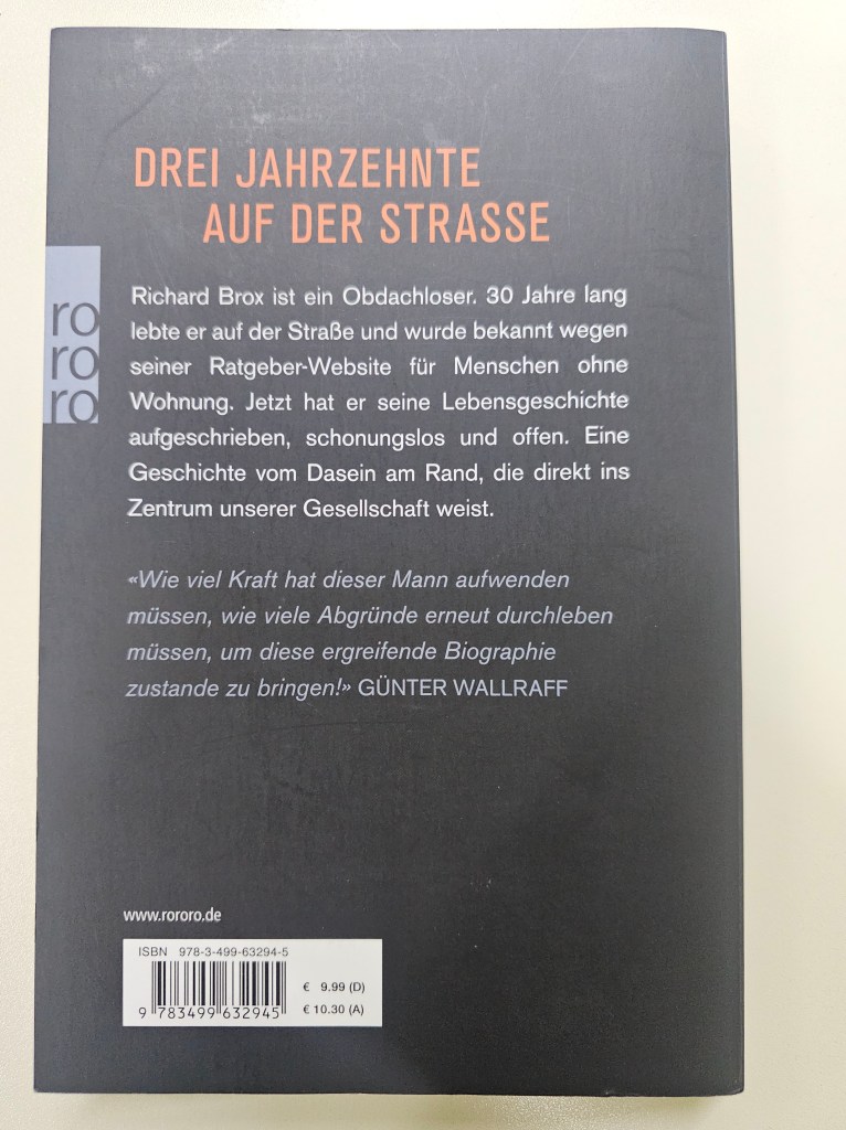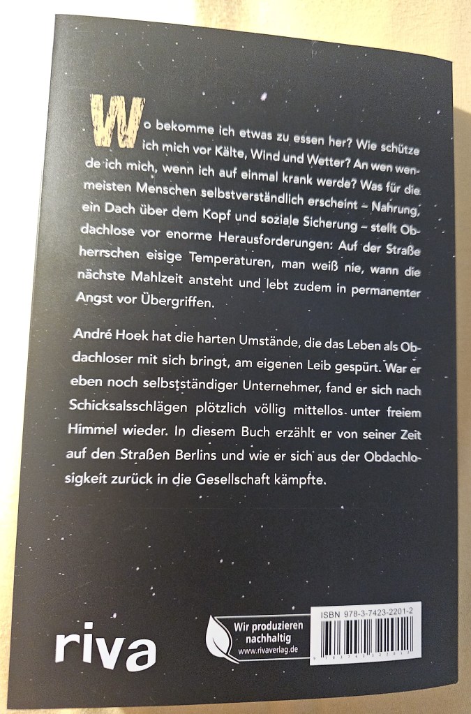 - André Hoek (der auch lange Zeit am Bf Lichtenberg als Streetworker tätig war) hatte ein erfülltes Leben, war glücklich verheiratet und erfolgreich im Beruf. Als er plötzlich alles verliert, findet er sich nach Schicksalsschlägen und einer immer stärker werdenden Alkoholsucht obdach- und mittellos auf der Straße wieder. Sein Leben am Rand der Gesellschaft wird bestimmt von eisigen Temperaturen, permanenter Angst vor Übergriffen und der ständigen Frage, woher man die nächste Mahlzeit bekommt. Ein Schicksal, das er am Ende beinahe mit dem Leben bezahlen muss. Schonungslos ehrlich erzählt André Hoek von seiner Zeit auf den Straßen Berlins und davon, wie er sich aus der Obdachlosigkeit zurück in die Gesellschaft gekämpft hat (auch als preisgekrönter Podcast z.B. unter https://unterfreiemhimmel.podigee.io/):