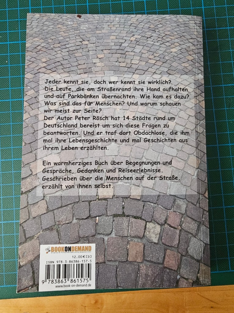 - Jeder kennt sie, doch wer kennt sie wirklich? Die Leute, die am Straßenrand ihre Hand aufhalten und auf Parkbänken übernachten. Wie kam es dazu? Was sind das für Menschen? Und warum schauen wir meist zur Seite? Der Autor Peter Rösch hat 14 Städte rund um Deutschland bereist um sich diese Fragen zu beantworten. Und er traf dort Obdachlose, die ihm mal ihre Lebensgeschichte und mal Geschichten aus ihrem Leben erzählten. Ein warmherziges Buch über Begegnungen und Gespräche, Gedanken und Reiseerlebnisse. Geschrieben über die Menschen auf der Straße, erzählt von ihnen selbst: