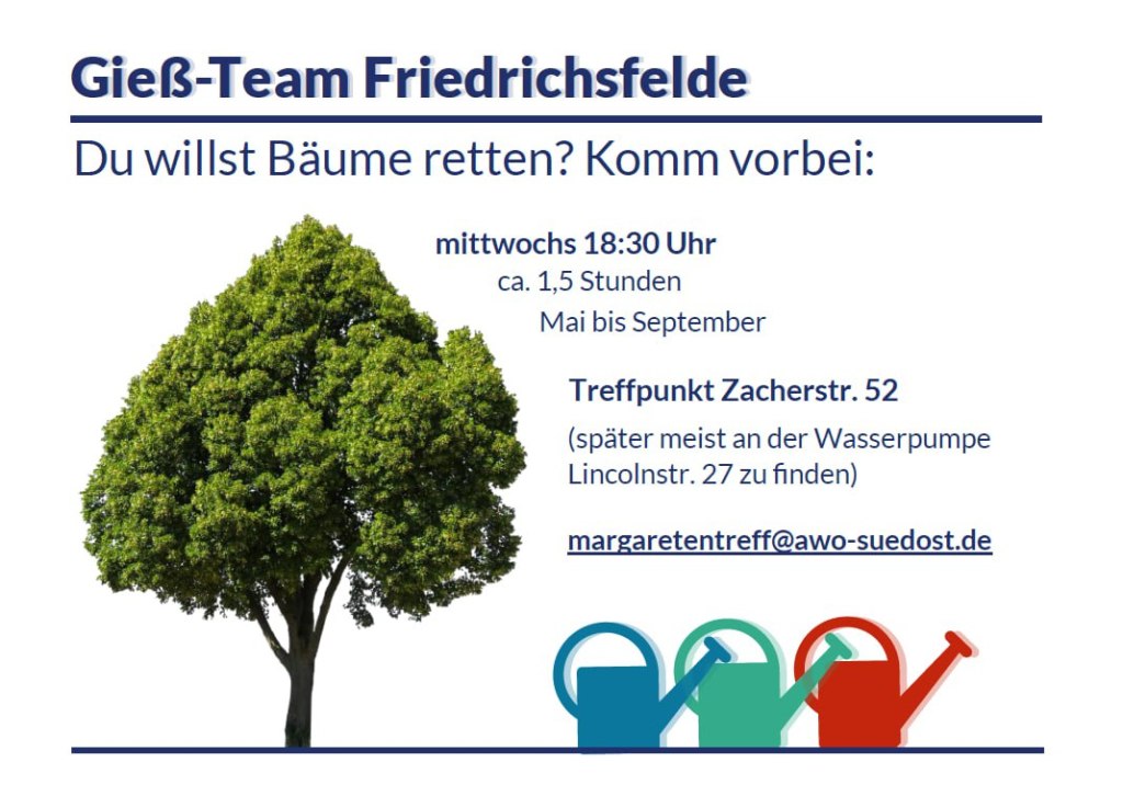 - Das Gießteam Friedrichsfelde kümmert sich von Frühjahr bis Herbst darum, regelmäßig Bäume zu gießen. Organisiert werden die Treffs (aber auch Spieleabende) über einen Telegramkanal: https://t.me/joinchat/rVjFNgOuUQpkMDNi – Treffpunkt ist immer mittwochs ab 17.30h der „Margaretentreff“ der AWO in der Zachertstr. 52. – Material wird gestellt (Bollerwagen, Kanister usw.):
