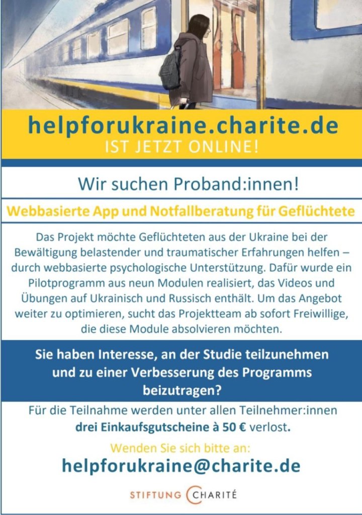 🇩🇪 helpforukraine.charite.de sucht Proband:innen für das Projekt „Webbasierte App und Notfallberatung für Geflüchtete aus der Ukraine“. Das Projekt möchte geflüchteten Ukrainer*innen bei der Bewältigung belastender und traumatischer Erfahrungen helfen – durch webbasierte psychologische Unterstützung – https://helpforukraine.charite.de/. 🇺🇦 helpforukraine.charite.de шукає волонтерів для проекту „Веб-додаток та екстрене консультування для людей, що втекли з України“. Проект має на меті допомогти українцям впоратися зі стресовими та травматичними переживаннями за допомогою психологічної підтримки онлайн https://helpforukraine.charite.de/: