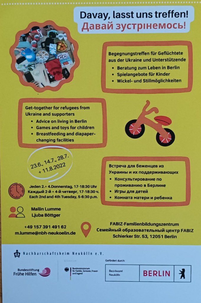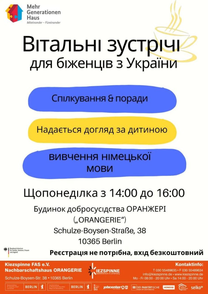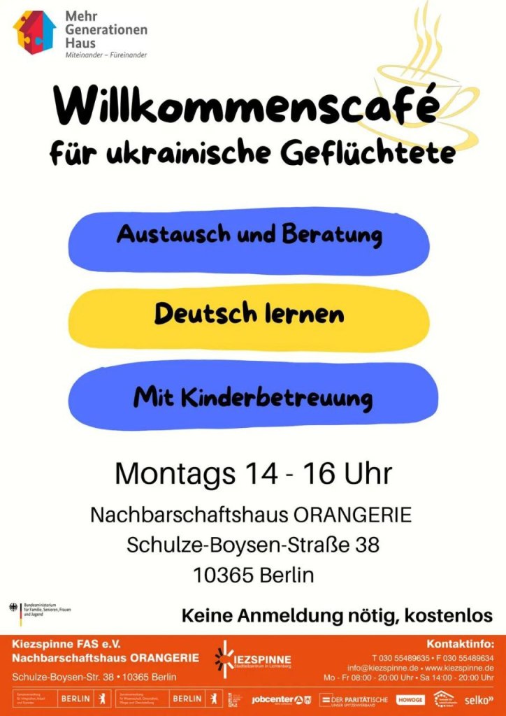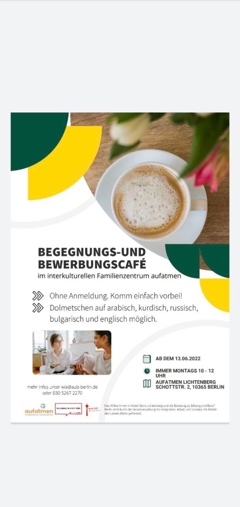 🇩🇪 Begegungs-und Bewerbungscafe für ukrainische Geflüchtete im Familienzentrum Aufatmen (immer Montags von 10 bis 12 Uhr). – Schottstr. 2 | 10365 Berlin – http://www.aufatmen-lichtenberg.de
