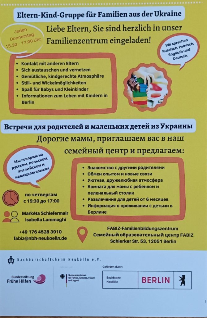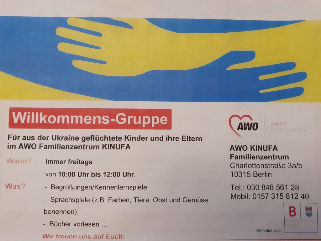 🇩🇪 Willkommensgruppe für geflüchtete Kinder und Frauen aus der Ukraine vom AWO Familienzentrum KINUFA – immer freitags von 10 bis 12 Uhr – Adresse: AWO KINUFA Familienzentrum, Charlottenstr. 3a/b, 10315 Berlin – Tel.: 03084856128 – Mob.: 01573158124 – 🇺🇦 Вітальна група для дітей та жінок біженців з України від сімейного центру AWO KINUFA – Завжди по п’ятницях з 10.00 до 12.00. – Адреса: Сімейний центр AWO KINUFA, Шарлоттенштрассе, 3a/b, 10315 Берлін – Тел.: 03084856128 – Моб. тел.: 01573158124: