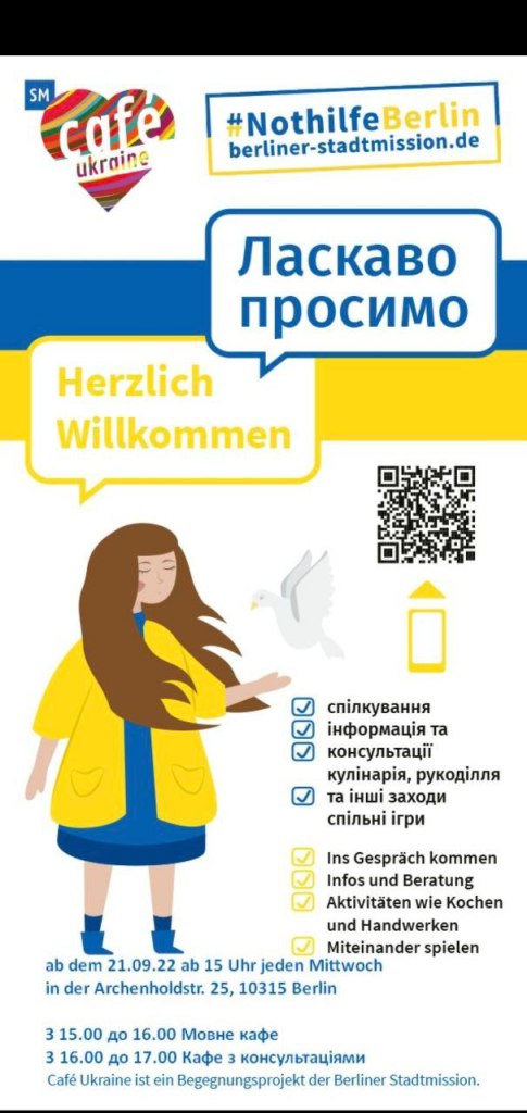 „Ihr seid neu in Berlin und sucht Informationen, Rat, Gespräche? Ab Donnerstag, dem 10.3. wird das Café in der Ulme35 zum Treffpunkt #Ukraine. Mit Menschen, die Ukrainisch, Deutsch und Russisch sprechen, Kinderbetreuung, Laptops, Internet und vielem mehr. Jede Woche von Montag bis Samstag, 14:00 – 18:00 Uhr, Ulmenallee 35, 14050 Berlin“: