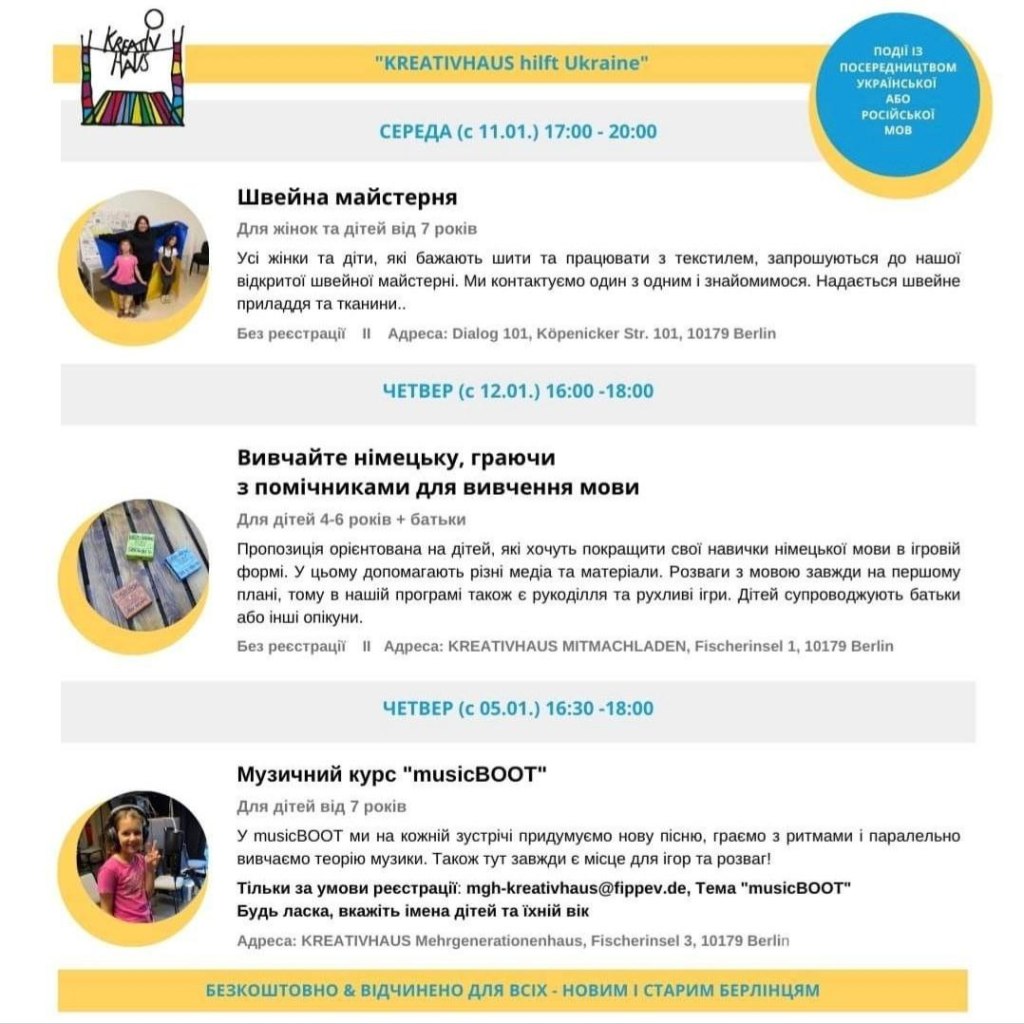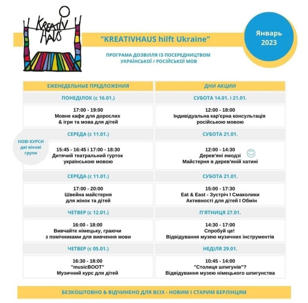 🇩🇪 Freizeitprogramm für ukrainische Geflüchtete vom KREATIVHAUS https://www.kreativhaus-berlin.de/freizeitprogramm-fuer-familien-aus-der-ukraine/ – 🇺🇦 Програма дозвілля від КREATIVHAUS для українських сімей https://www.kreativhaus-berlin.de/freizeitprogramm-ukr/ :