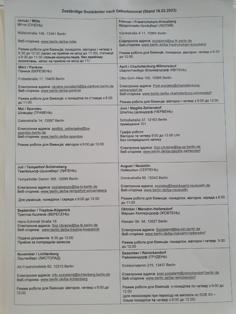 🇩🇪 Zuständige Sozialämter nach Geburtsmonat – 🇺🇦 Список соціаламтів стосовно місяцю народження (для біженців, які проживають у гуртожитках): – ▪️Miтте (СІЧЕНЬ)