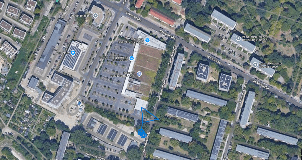 Treffpunkt: Wendeschleife bzw. Lieferzone Kaufland, Huronseestr. (s. Foto, zum Vergrößern anklicken)