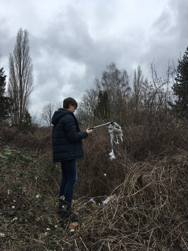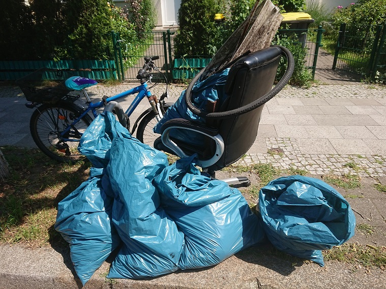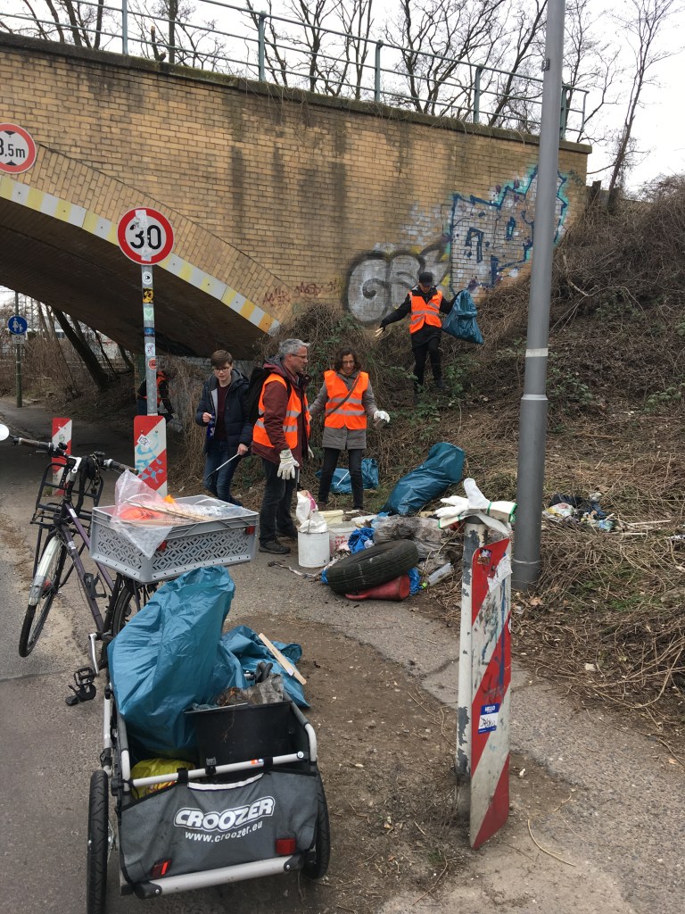 Ausgehend von der Eggersdorfer Str. entlang des Kraatz-Tränke-Grabens zum Osterwäldchen – von dort über Tierpark Richtung Zwieseler Str. sowie zur Köpenicker Alle und das ganze zurück – 5h CleanUp. Aus dem Gebüsch geklaubt: