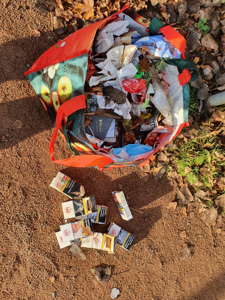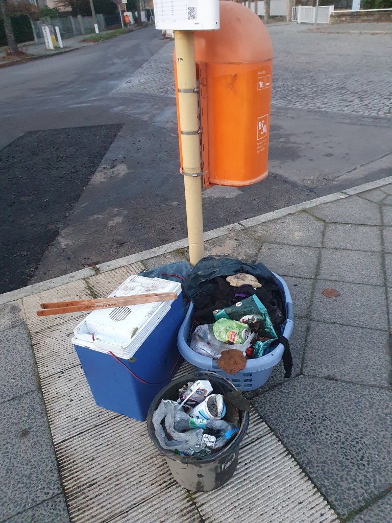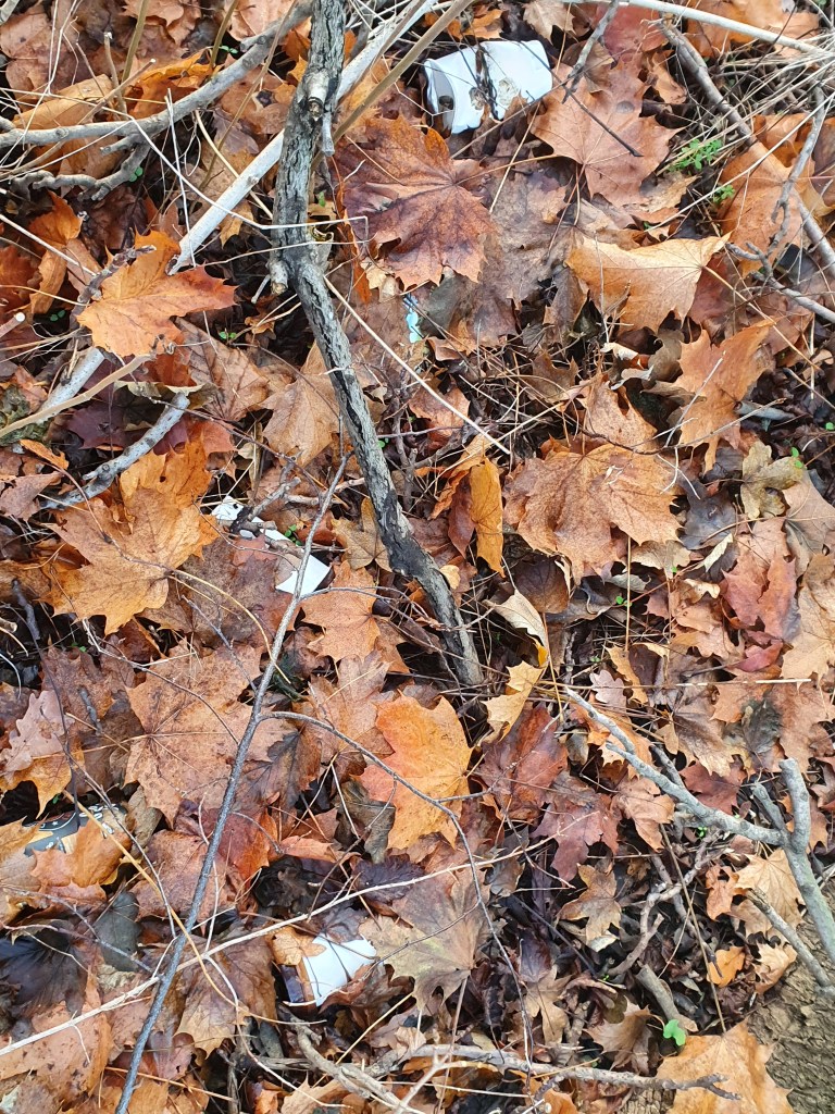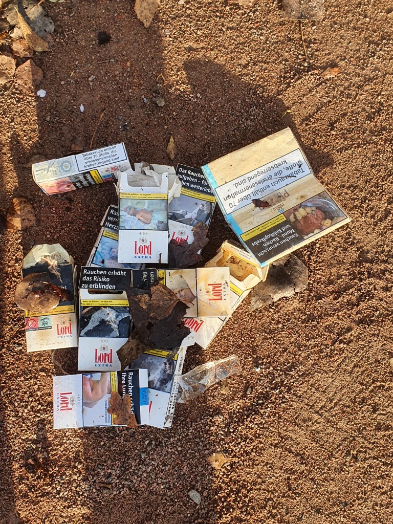 3 volle Windeln, 2 Regenschirme, ein Wäschekorb – eine Kühltruhe – ein Fernseher – ein Einkaufswagen – zwei Rückenlehnen – einen Fangkorb eines Rasenmähers – ein zerstörter Kinderwagen – Altkleider – Reste eines Gartenzauns, natürlich Glas, Glasbruch, Verpackungen – und vor allem Unmengen Masken, noch mehr To-Go (To-Throw?)-Becher: Auf dem einem Bild sind drei zu sehen, es lagen aber genau auf dem Ausschnitt 9(!) unter dem Laub – die Kippenschachteln auf dem anderen Bild befanden sich alle direkt hinter dem Zaun einer Grundschule, an die anderen war nicht dranzukommen – die ca. 40 Kippen lagen übrigens auf max. 2qm verstreut am Volkradpark (auf dem Rückweg gefunden, deswegen so dunkel).