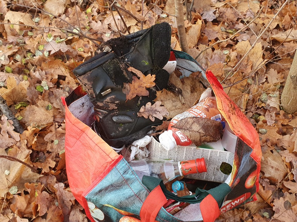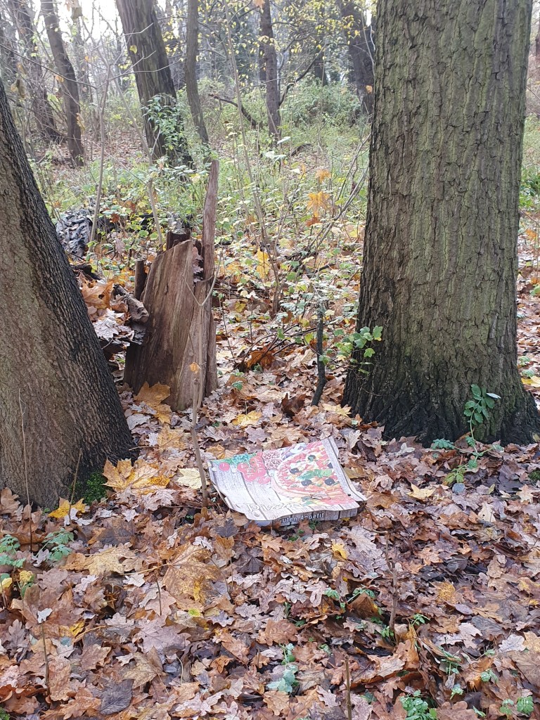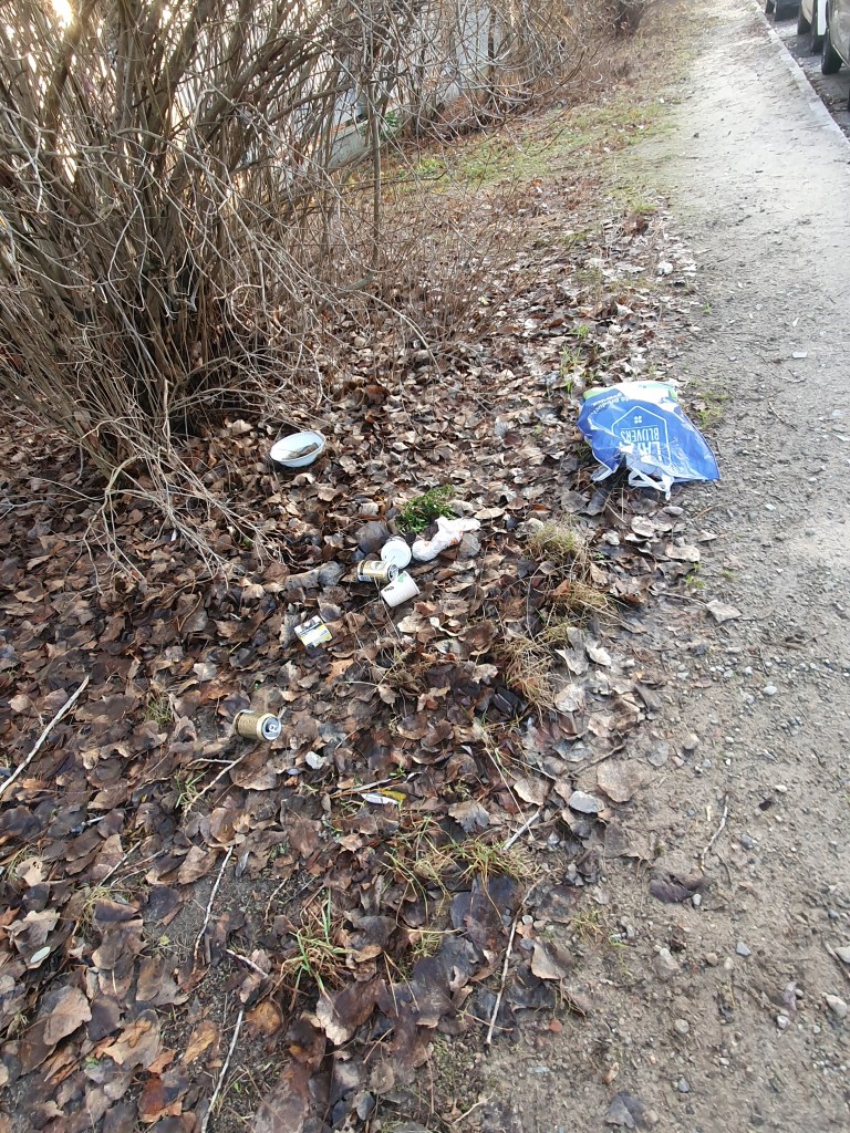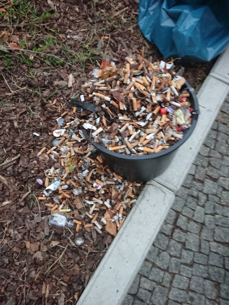 3 volle Windeln, 2 Regenschirme, ein Wäschekorb – eine Kühltruhe – ein Fernseher – ein Einkaufswagen – zwei Rückenlehnen – einen Fangkorb eines Rasenmähers – ein zerstörter Kinderwagen – Altkleider – Reste eines Gartenzauns, natürlich Glas, Glasbruch, Verpackungen – und vor allem Unmengen Masken, noch mehr To-Go (To-Throw?)-Becher: Auf dem einem Bild sind drei zu sehen, es lagen aber genau auf dem Ausschnitt 9(!) unter dem Laub – die Kippenschachteln auf dem anderen Bild befanden sich alle direkt hinter dem Zaun einer Grundschule, an die anderen war nicht dranzukommen – die ca. 40 Kippen lagen übrigens auf max. 2qm verstreut am Volkradpark (auf dem Rückweg gefunden, deswegen so dunkel).