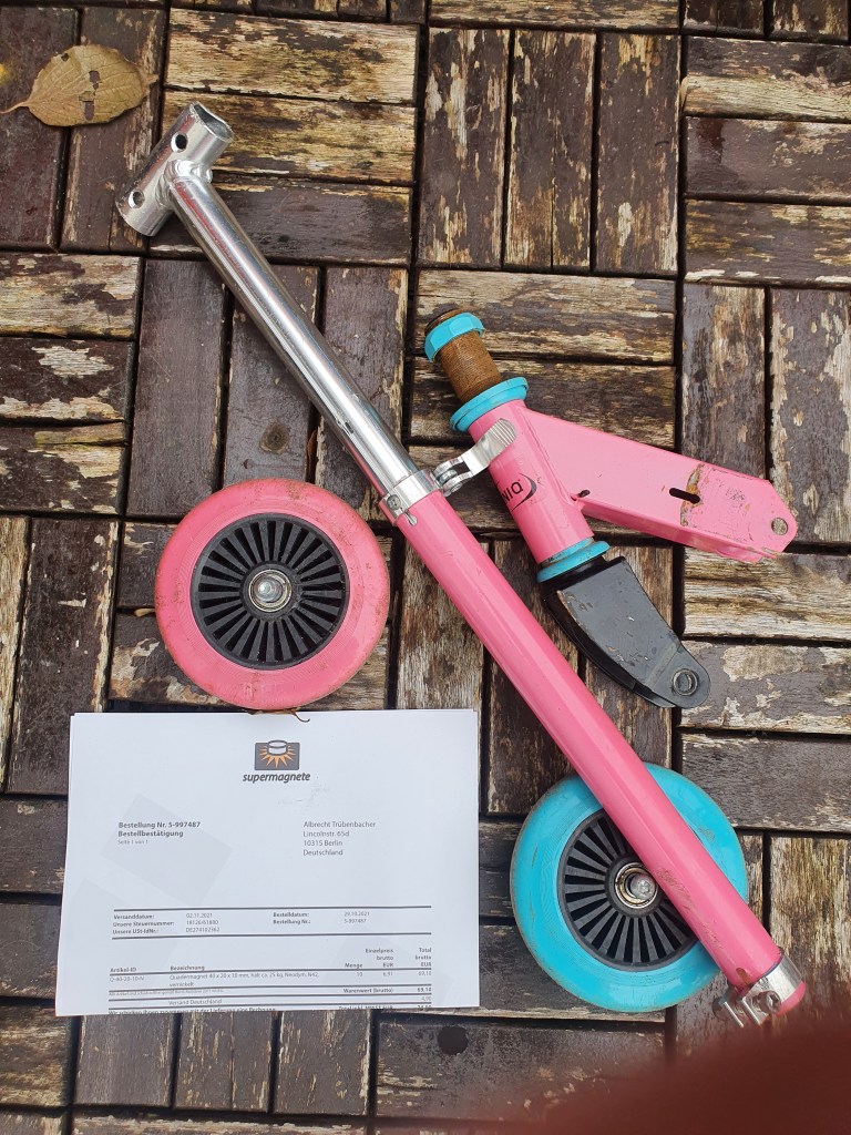 - Baumaterial für den Kronkorkenmäher sowie 10 Neodymmagnete 4cm x 2cm x 1cm mit einer Haftkraft von 25kg – unglaublich, was so ein kleines Stück Metall heben kann