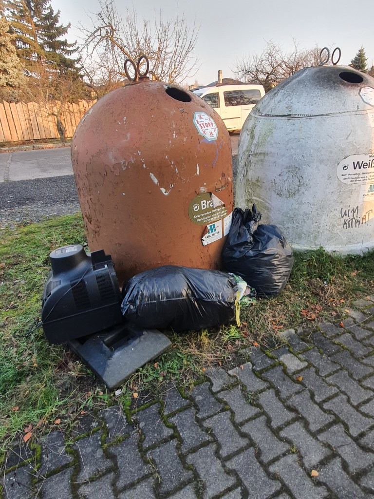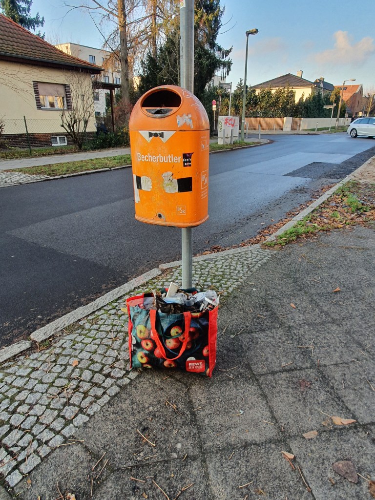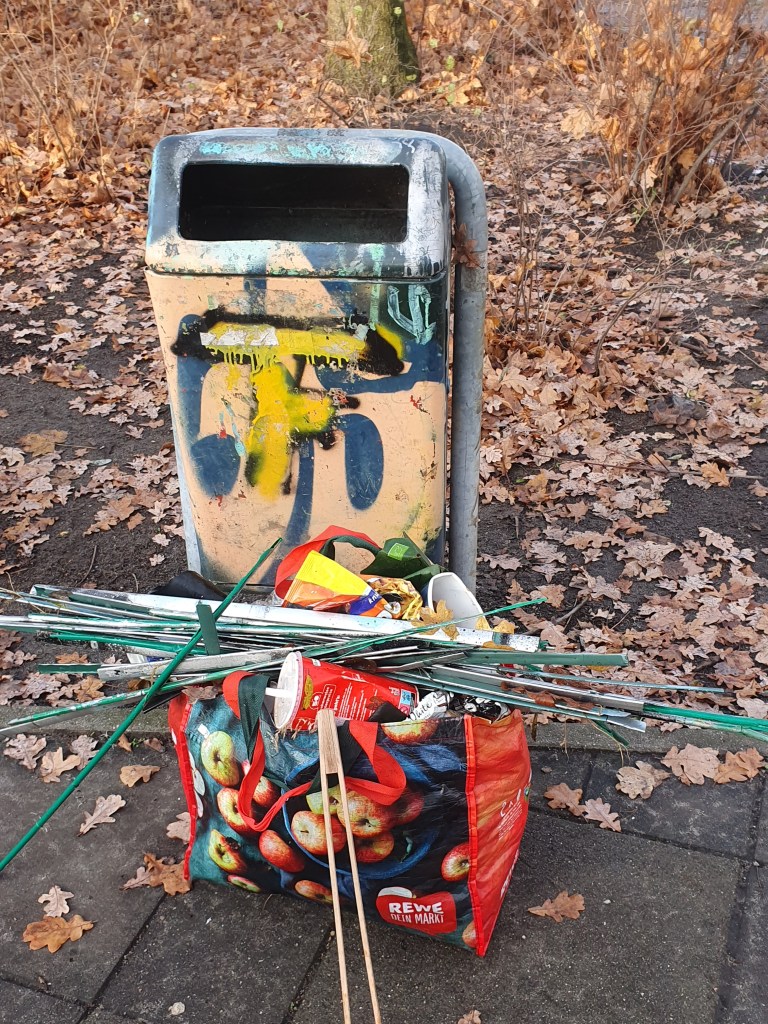 Alles in allem: 5 volle große, dichtgepackte Einkaufstaschen, 2 volle Eimer, 2 Müllkippen gemeldet … ich muss ehrlich sagen, anfangs wurde mir kalt vor Wut über den Dreck, aber dann dominierte doch eher die wärmende Bewegung und glühender Zorn über das, was hier einige meinen, tun zu dürfen, dass sie glauben, es sei lässlich, seinen oder ihren nicht mehr benötigten Unrat in die Gegend entsorgen zu dürfen. Positiv: Kontakt geknüpft zu den „Fiffi-Fegern“ http://www.fiffi-feger-karlshorst.de/, die seit Jahren, eher Jahrzehnten in Karlshorst sauber machen – Danke für den Glühwein – und hoffentlich bis spätestens zum Frühjahr zum gemeinsamen CleanUp im Biesenhorster Sand!