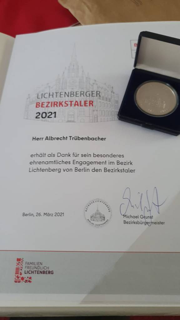 „Das Bezirksamt Lichtenberg hat den dritten Bezirkstaler 2021 an Albrecht Trübenbacher verliehen. Albrecht Trübenbacher ist seit Jahren Mitglied der Bürgerjury für den Kiezfonds Neu-Lichtenberg. […] Im September 2017 startete er eine nachbarschaftliche Müllsammelaktion über das Projekt „Kehrenbürger“ der BSR und engagiert sich seither für die Umwelt und Nachbarschaftsverschönerung, auch in Coronazeiten. Er organisierte verschiedene Aufräumeinsätze über die Grenzen des Bezirks Lichtenberg hinaus, bei denen große Mengen Müll gesammelt und entsorgt wurden. Albrecht Trübenbacher motiviert Anwohnerinnen und Anwohner durch Berichterstattung in den sozialen Medien zum Mitmachen. Auch bei den letzten Freiwilligentagen im September 2020 war er mit einer seiner kiezbekannten Zigaretten-Sammelaktionen und einem Kochabend für Bedürftige dabei.“