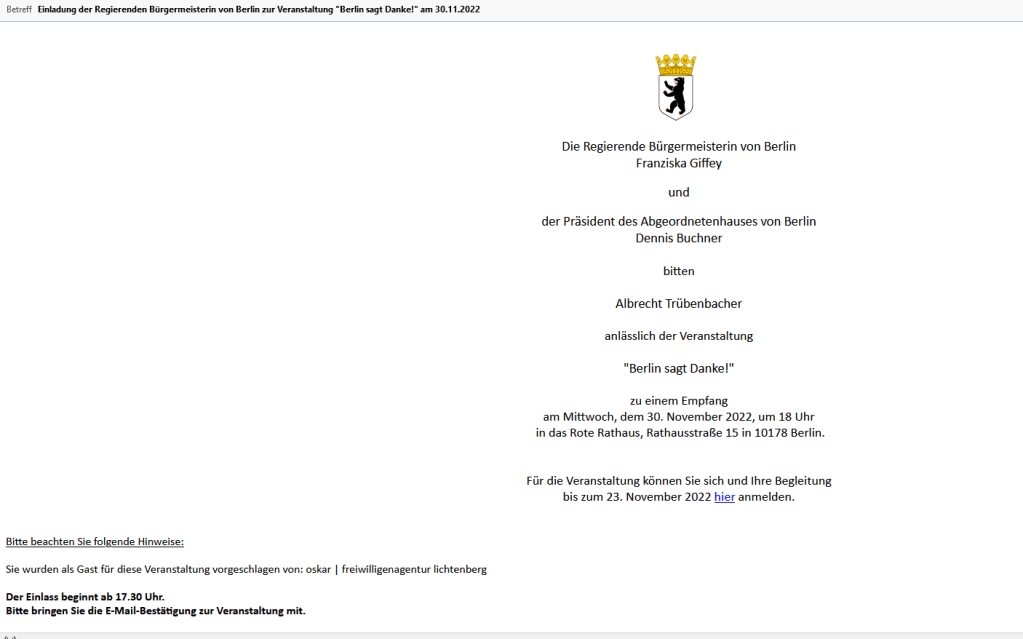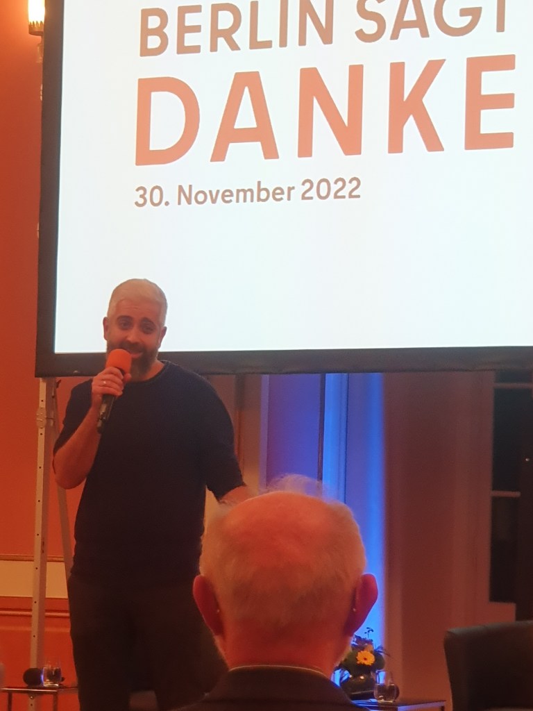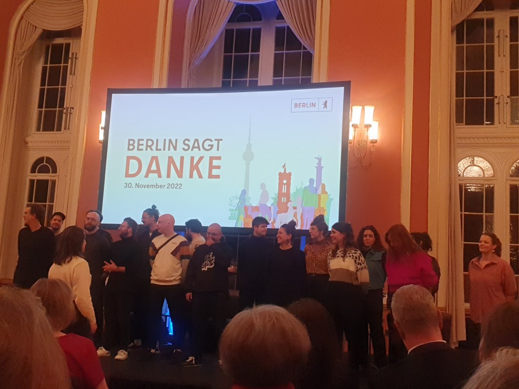 Danke an OSKAR (-> https://oskar.berlin/ ), die uns vorschlugen, und natürlich an den Senat für die Anerkennung unserer Tätigkeit! – Herzlichen Dank an Berlin für die Veranstaltung „Berlin sagt Danke“, zu der wir gestern eingeladen waren.