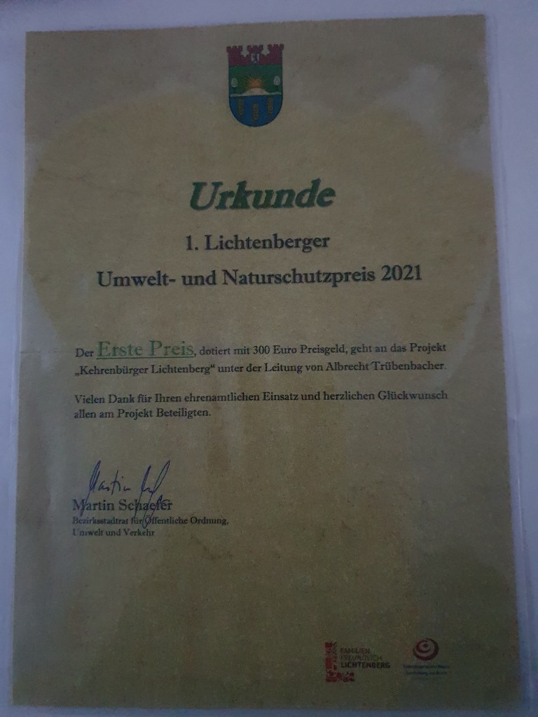 Anlässlich des heutigen Lichtenberger Lichterfestes Ehrung der „Kehrenbürger LICHTENBERG“ als Gewinner des 1. Lichtenberger Umweltpreises 2021 (nachträglich verliehen) – nochmals Dank an den Bezirk, an die Sozialraumorientierte Planungskoordination, die Stadtteilkoordination, die OSKAR Freiwilligenagentur sowie natürlich an die hunderten helfenden Hände bei unseren CleanUps!