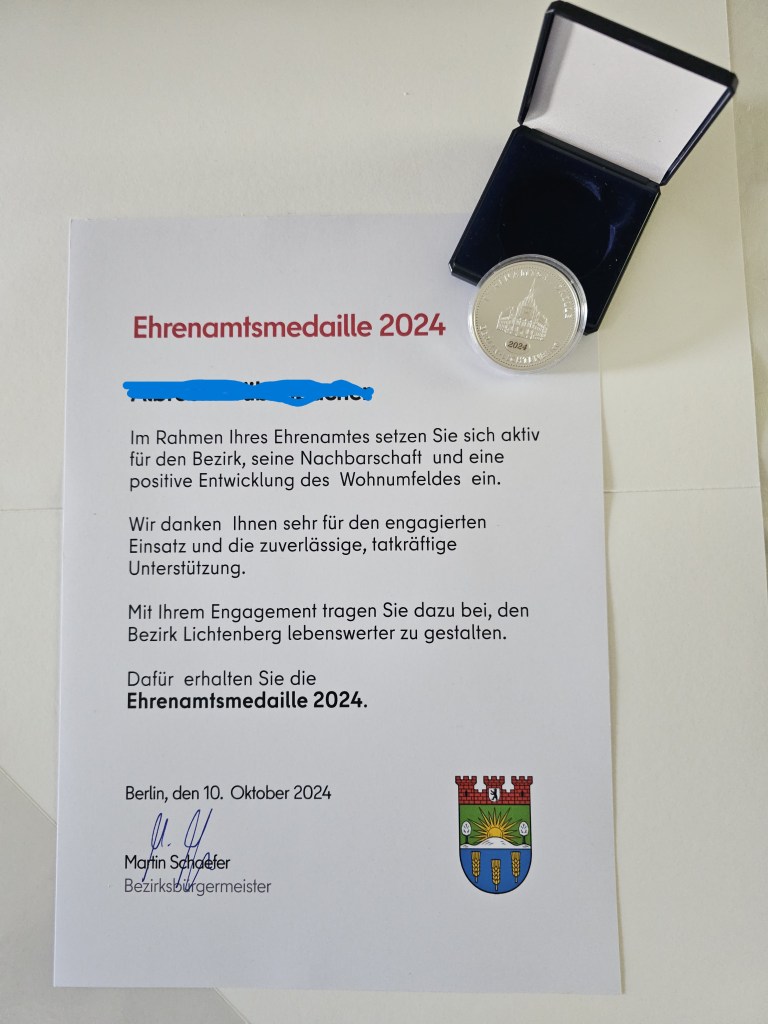 2024-10-10: Wir danken dem Bezirk Lichtenberg und dem Freiwilligenrat Lichtenberg, die uns und andere für unser ehrenamtliches Engagement mit der Ehrenamtsmedaille 2024 auszeichneten. Eindrücke von dem gelungenen Abend im Kulturhaus Karlshorst sind den Fotos zu entnehmen.