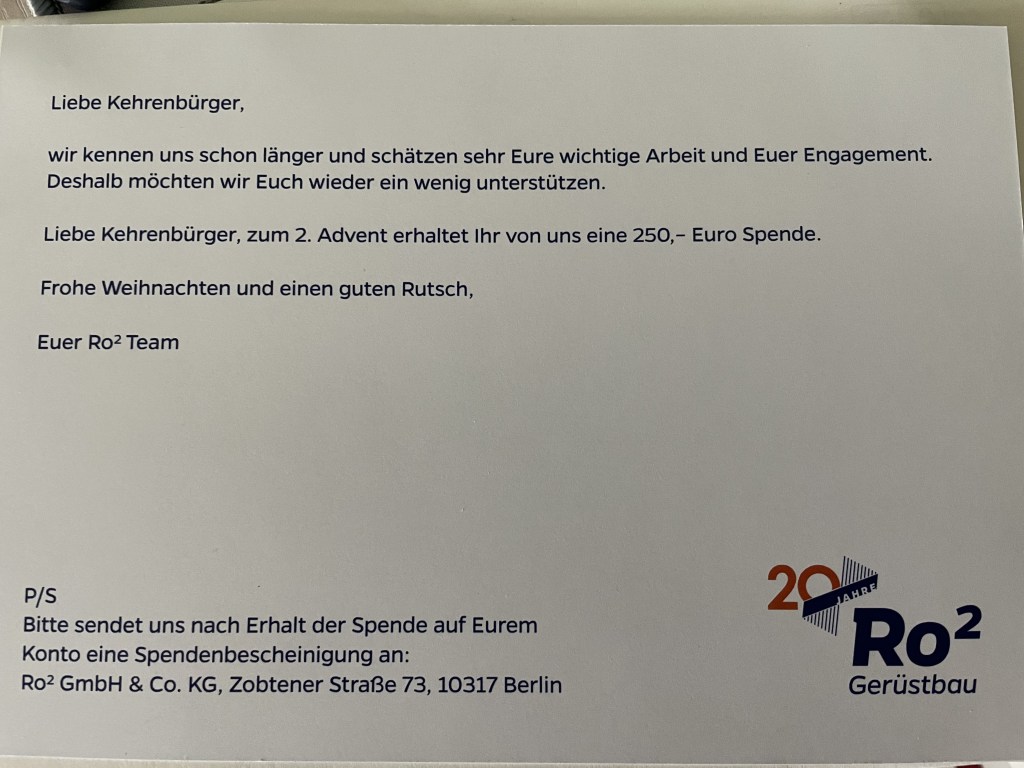 Ein herzliches Dankeschön an die Gerüstbauer von Ro2 (Ro2 Gerüstbau GmbH & CO. KG https://ro2-geruestbau.de/) für die mehr als großzügige Spende zur Unterstützung unserer Aktivitäten als „Kehrenbürger LICHTENBERG“!