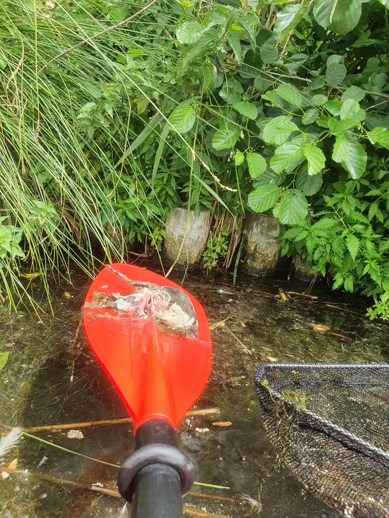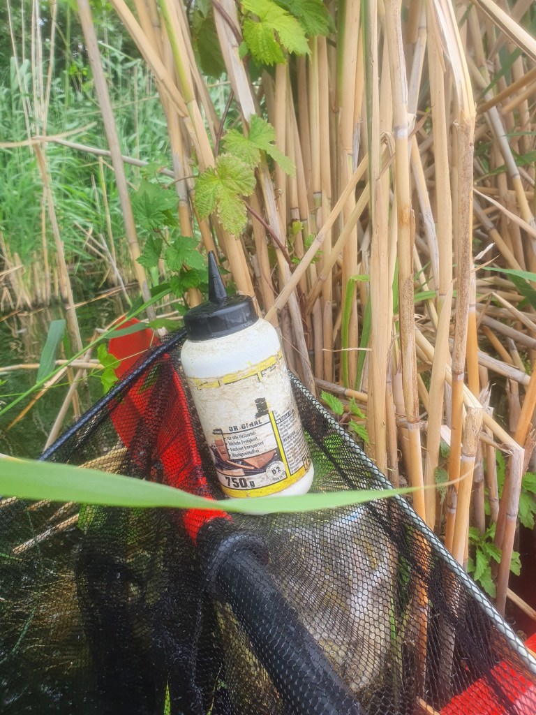 1,5h alleine unterwegs gewesen – Verpackungsmüll aller Art und aller Hersteller herausgefischt – Danke an CocaCola, Capri Sonne, Nestlé, usw. und die gedankenlosen Verbraucher:innen. – Nicht alles, was im Wasser trieb, entpuppte sich bei näherer Betrachtung als mitnehmenswerter Dreck: Manch tote Ratte, toter Fisch oder tote Ente trieb im Wasser.