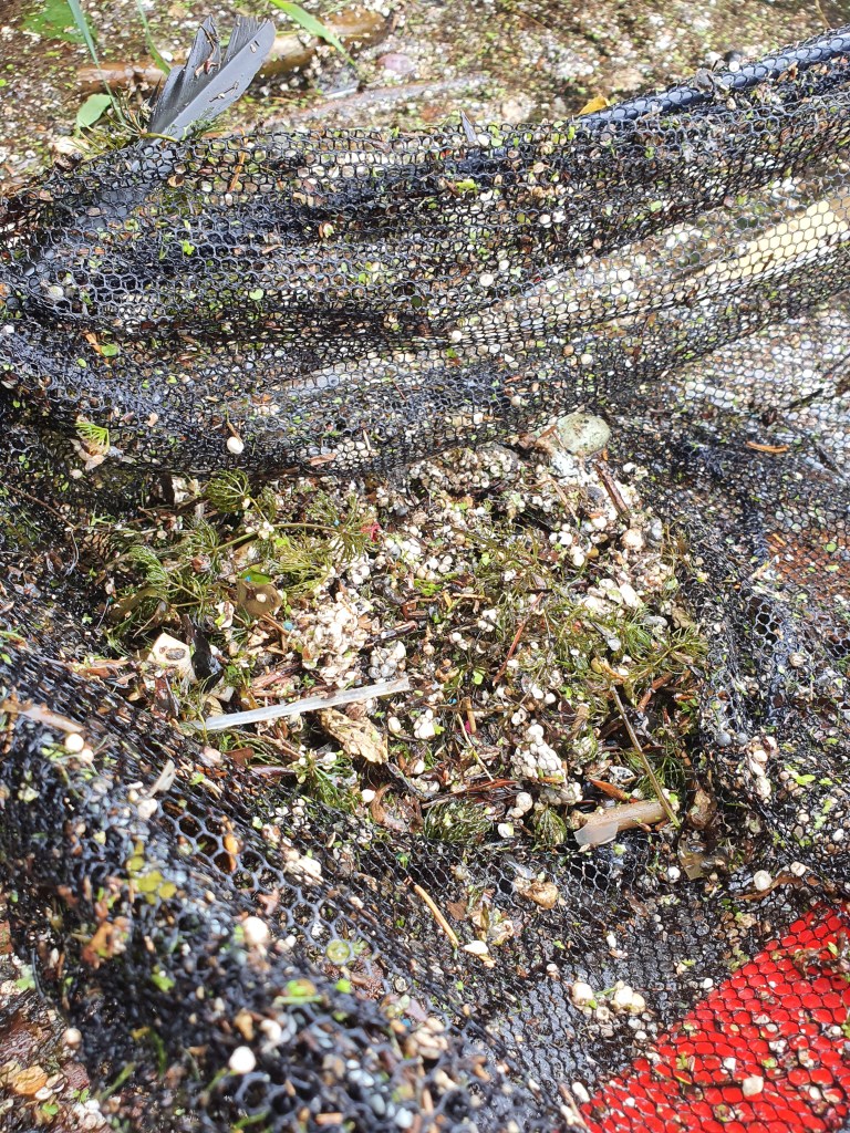 Frisbeescheiben, Baumaterialien, Kippen (natürlich), Styropor, Anglerzubehör, Dosen (leer und voll), Plastik- und Glasflaschen, Überreste von Masken u.a.m.. Insbesondere die Unmenge an kleingeriebenem Styropor im Brutgebiet von Vögeln und Fischen illustriert das Problem von kleinteiligem Kunststoff; daneben waren die grünlich veralgten Plastiktüten kaum von Wasserpflanzen zu unterscheiden, was Tiere sicherlich auch so erleben, wenn sie das Zeug schlucken – man könnte Tränen in die Augen kriegen, wenn man sieht, was da alles in der Natur landet. Immerhin fand sich auch etwas im Wasser für eine eventuelle Abendgestaltung gegen den Frust 😀