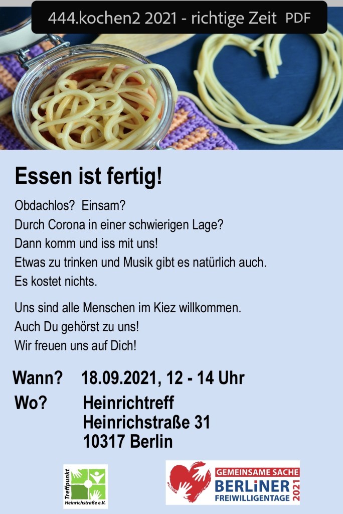 Danke an die Gemeinde EFG Heinrichstraße, die die durch uns 2020 und 2021 begründeten Kochaktionen seitdem weiterführen (https://efg-berlin-lichtenberg.clubdesk.com/willkommen) sowie ebenso an die Musiker von „Garantierte Erpelpelle“ und „Antenne Spätkauf“, die seit Anfang an ehrenamtlich dabei sind: