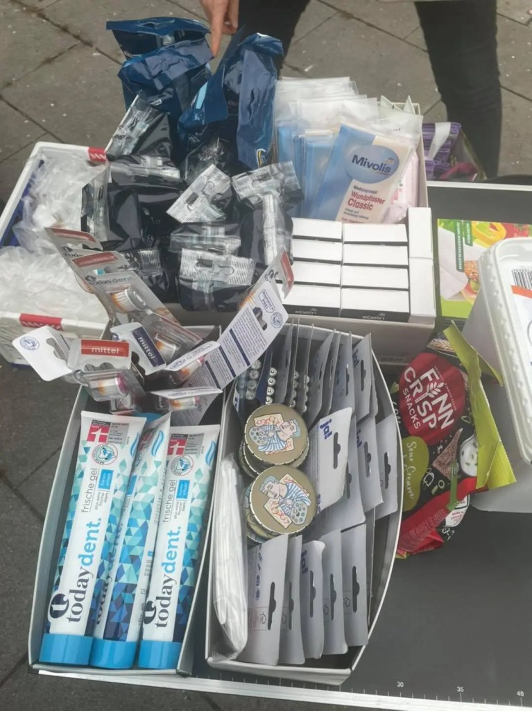 Letzte Woche Montag kontaktierten uns die „Kehrenbürger Lichtenberg“. Sie hatten im Rahmen der Freiwilligentage schon zum 2. Mal in Folge ein Essen für und mit allen Menschen im Kiez organisiert. Unter dem Motto „Essen ist fertig“ war jede:r eingeladen. Von dem Essen waren noch Geschenktüten und Spendengelder übrig, welche sie uns anboten. Natürlich haben wir das Angebot angenommen. Kurzerhand brachte man am Abend zur Ausgabe die Tüten und das Geld. Die Geschenktüten waren zusammengestellt mit Einwegrasierern, Rasierschaum, Zahnbürsten, Zahnpasta, Nagelscherensets, Konservendosen, Trinkflaschen, Wundpflaster, Batterien und Tüten mit Damenhygiene. Diese Woche Montag wurden diese Dinge bei der Ausgabe ausgeteilt. Außerdem hatten wir Kartoffelsuppe und selbst gebackenes Brot von Frank und Gulasch mit Nudeln oder Kartoffeln von Ina. Jule hat bei der Arbeit fleißig Wraps vorbereitet, diese aber zuhause im Kühlschrank vergessen. Kein Problem, die Wraps fanden am Dienstag glückliche Abnehmer bei der Ausgabe von Dani in Neukölln.
