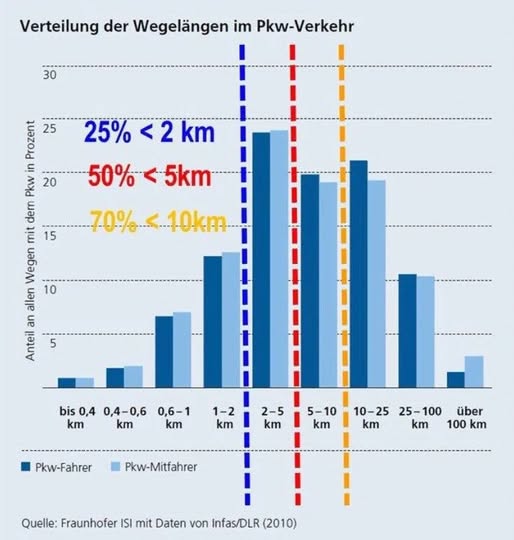 - einige leicht zu recherchierende „Funfacts“: 13 Millionen Erwachsene hierzulande haben keinen Führerschein – 40% der Haushalte in einer Stadt haben kein Auto – 20% der Haushalte auf dem Land leben autofrei – 40-50% des Autoverkehrs verlaufen über Strecken über max. 5km – in Berlin beansprucht das Auto knapp 60 Prozent des verfügbaren städtischen Raums – der Straßenverkehr kostet jedes Jahr 150 Mrd. Euro (ohne Kosten durch Stau), „das Auto“ generiert aber nur 50 Mrd. Euro Einnahmen – jeder Einwohner subventioniert den Autoverkehr mit 150€/ Jahr – seit 1950 wurden 35 000km Bahnlinien sowie 6000 Bahnhöfe stillgelegt – bis 1966 war es verboten, auf Straßenland zu parken -Die Parkplatz-Umsatz-Rentabilität von Fahrrad-Parkplätzen ist höher als bei Pkw-Parkplätzen – Für 80 % der Umsätze des Einzelhandels sorgen die Kunden, die im Umweltverbund unterwegs sind – 10% mehr Straßenfläche bedeuten 10% Straßenverkehr mehr …